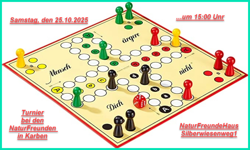 Die NaturFreunde Karben laden auch in diesem Jahr wieder alle Spielfreudigen zum beliebten „Mensch-ärgere-Dich-nicht“-Turnier ein. Am Samstag, den 25. Oktober 2025, heißt es ab 15:00 Uhr im Haus der NaturFreunde: Würfeln, lachen – und sich vielleicht ein bisschen ärgern.